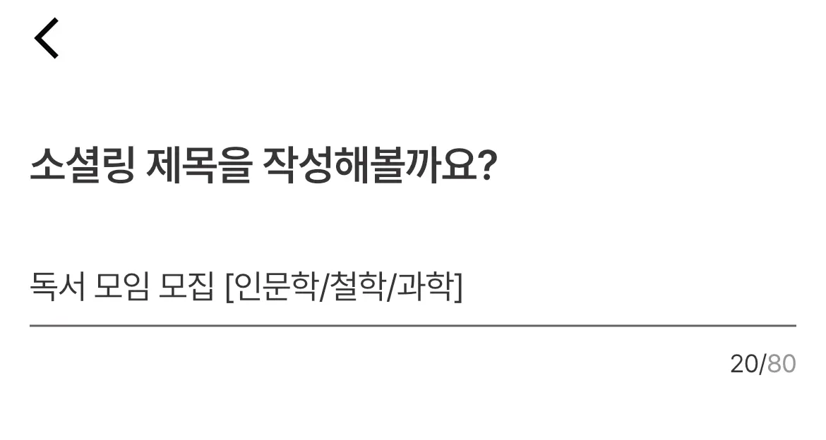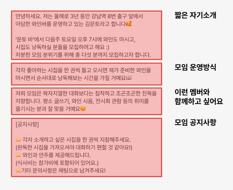 문토에서는 상업적 목적이 지나치게 뚜렷한 제목을 사용한 모임보다 ’서로 취향과 관심사를 나눈다는 친근한 제목’의 모임 신청률이 더 높데요!