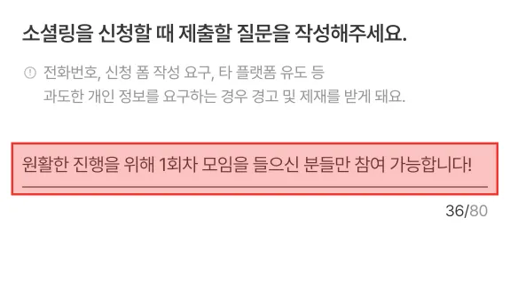 더불어, 소셜링을 승인제로 개설하신다면 이전 회차를 듣지 않은 멤버분들이 참가하지 못하도록 하실 수 있어요.