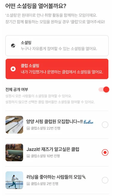 클럽을 오픈했다면, 원하는 콘텐츠로 클럽 소셜링을 오픈해 보세요!
