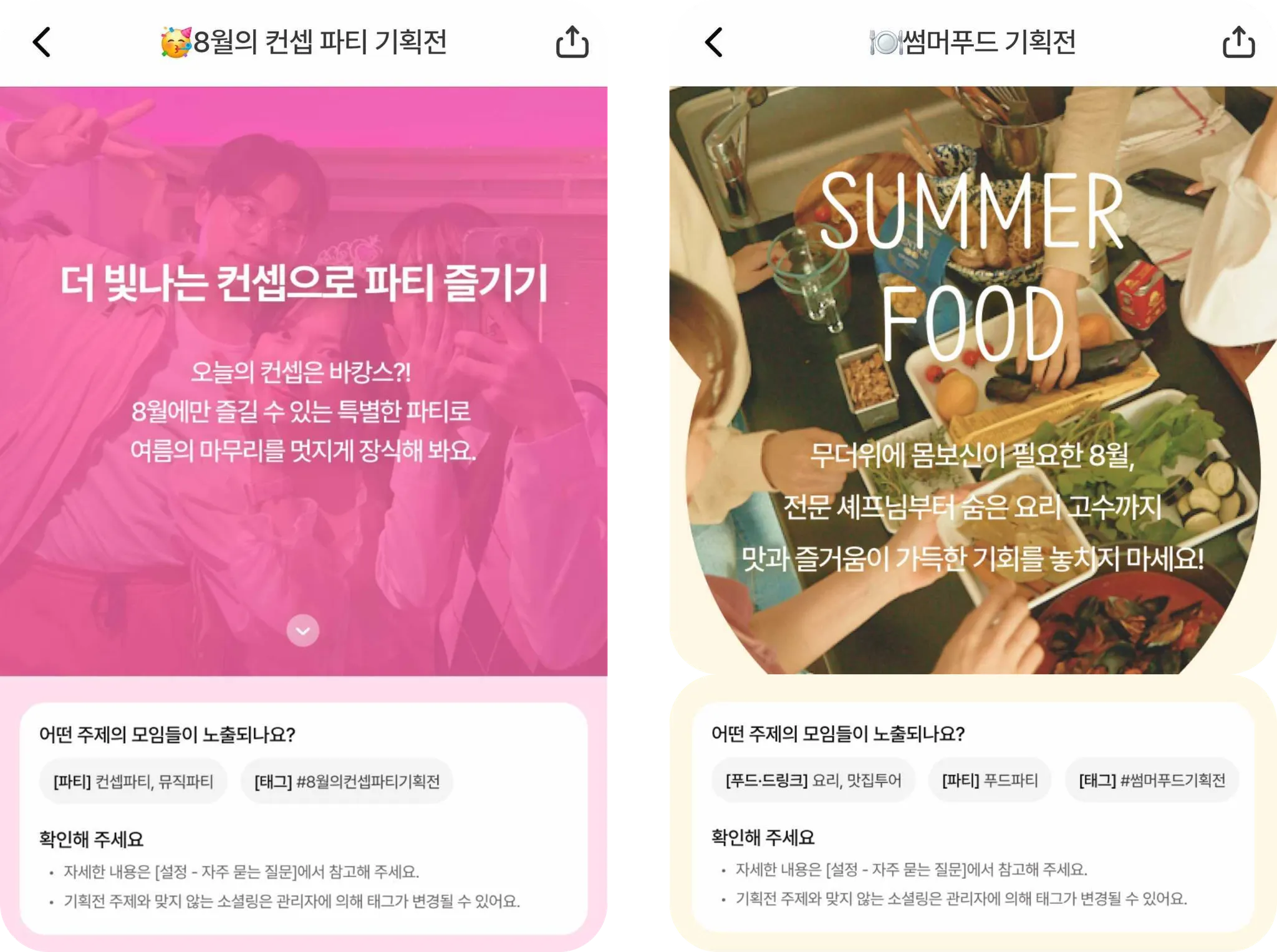 기획전은 시즌(명절, 휴가철, 계절 등) 또는 테마(썸머푸드, 8월의 컨셉 파티 등)를 선정해서 '주제에 맞는 모임'들을 한 곳에 모아 보여드리는 이벤트에요!