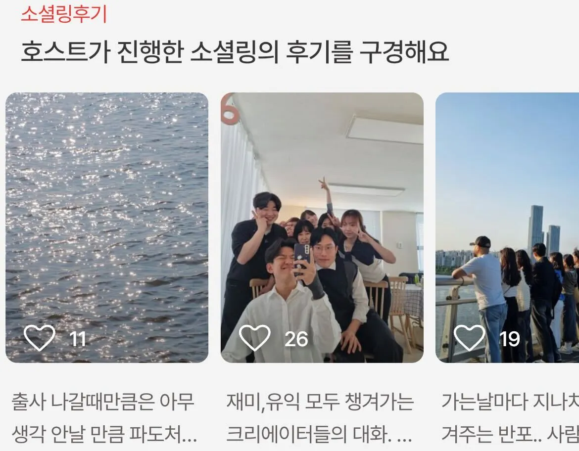소셜링 설명 페이지 하단에는 호스트가 진행한 소셜링들의 후기를 확인할 수 있는 공간이 마련되어 있어요!